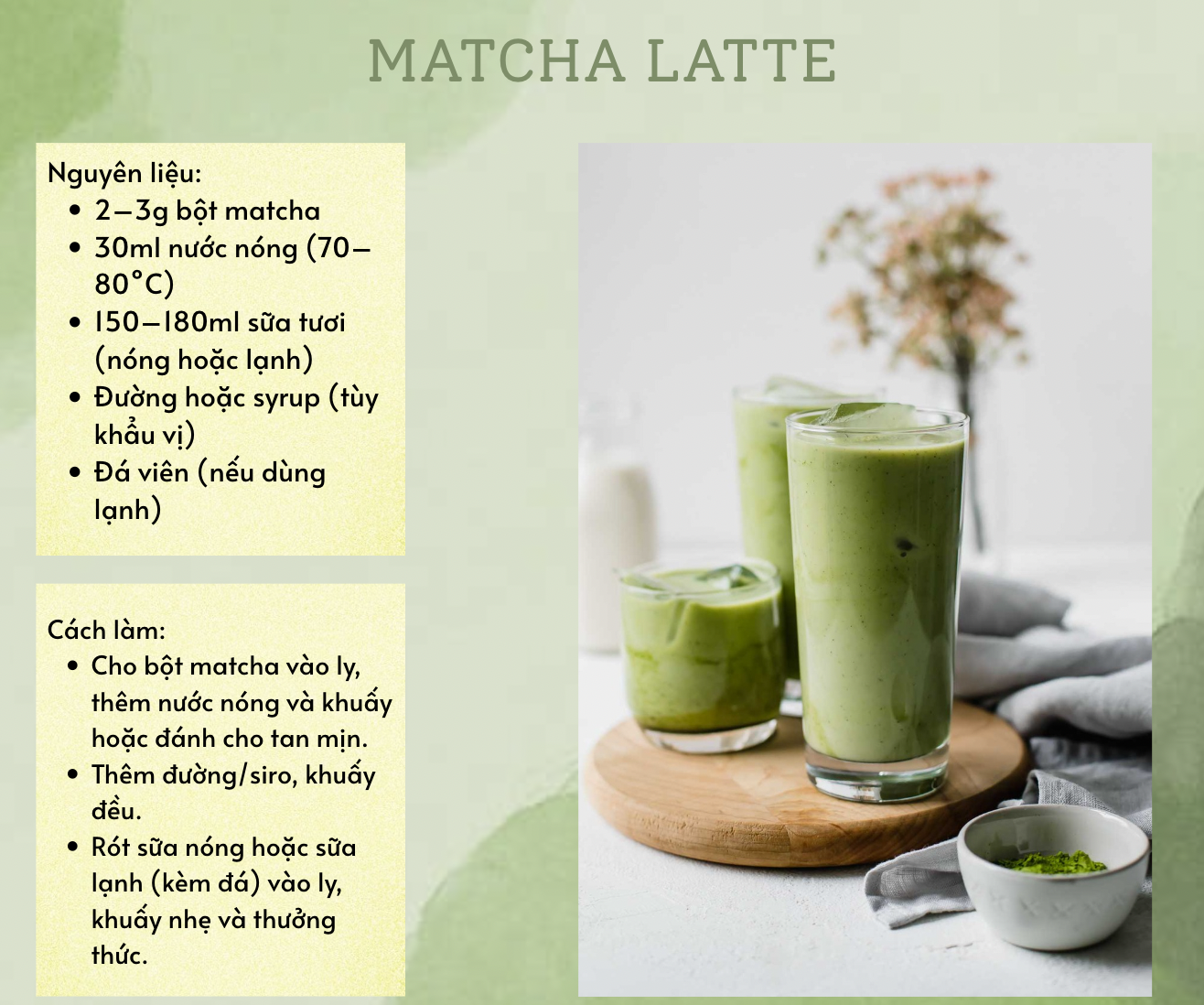 Matcha Latte là sự kết hợp giữa bột matcha thơm lừng và vị béo ngậy của sữa, mang lại hương vị ngọt ngào và khó quên.